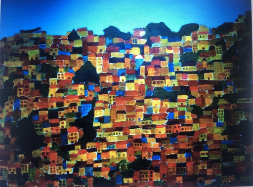 Na het experiment met "happy art" onderzocht ik de mogelijkheid van het toevoegen van extra reliëf in een schilderij door het gebruik van silikonenkit. Lijnen werden verdikt. Ik gebruikte deze techniek bij het maken van een serie schilderijen van, onder andere, gebouwen en een waterput. Hoewel het effect wel aardig was, bracht het geen extra inspiratie of enthousiasme. Dit bleek geen richting te zijn die ik verder wou onderzoeken.